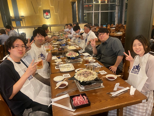 当日は、多くの方に出席いただき、和やかな雰囲気の中で会が始まりました。料理は北海道の名物ジンギスカンをはじめ、新鮮な野菜やザンギ、カレー、デザートなどがバイキング形式で用意されており、黒ビールなどのお酒やソフトドリンクも充実していました。さまざまなお酒を楽しむ方や、すべての料理を制覇しようとする方がいる一方で、カレーだけをひたすら食べ続ける方もおり、参加者それぞれが思い思いに好きなメニューを満喫していました。私も食事やお酒を楽しみながら、普段あまりお話しできない先輩方とたくさん交流することができ、とても貴重な時間を過ごしました。