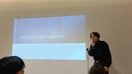 新人の発表は、過度に堅苦しいものではなく、各々の入社してからの経験を社内での開発、外出した時の様子等を発表しました。和やかな雰囲気の中で進行することができました。